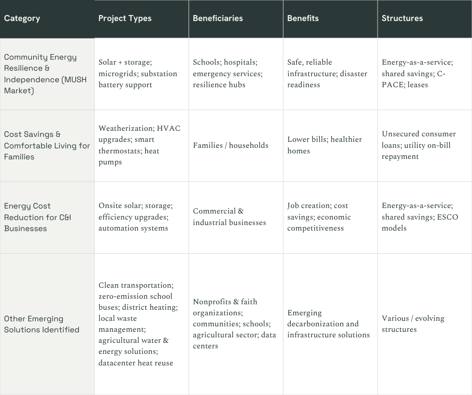 MIF advances customer solutions, practical and finance-ready project models that communities can adapt to priorities such as energy affordability, clean transportation, and access to clean water, while connecting those priorities to private investment. CGC provides tools and market expertise to build investor-ready portfolios, and ICLEI USA delivers training and technical assistance to strengthen local capacity and project development.
