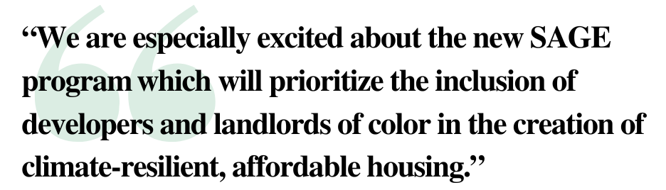 “We are especially excited about the new SAGE program which will prioritize the inclusion of developers and landlords of color in the creation of climate-resilient, affordable housing,” said Ms. Andrade. “SAGE will support projects led by community members, for community members with a focus on minority, Black, Latino, and female-led midsize affordable housing developments. We are eager to begin this work in South Florida, with the goal of scaling our model across the Southeast.”